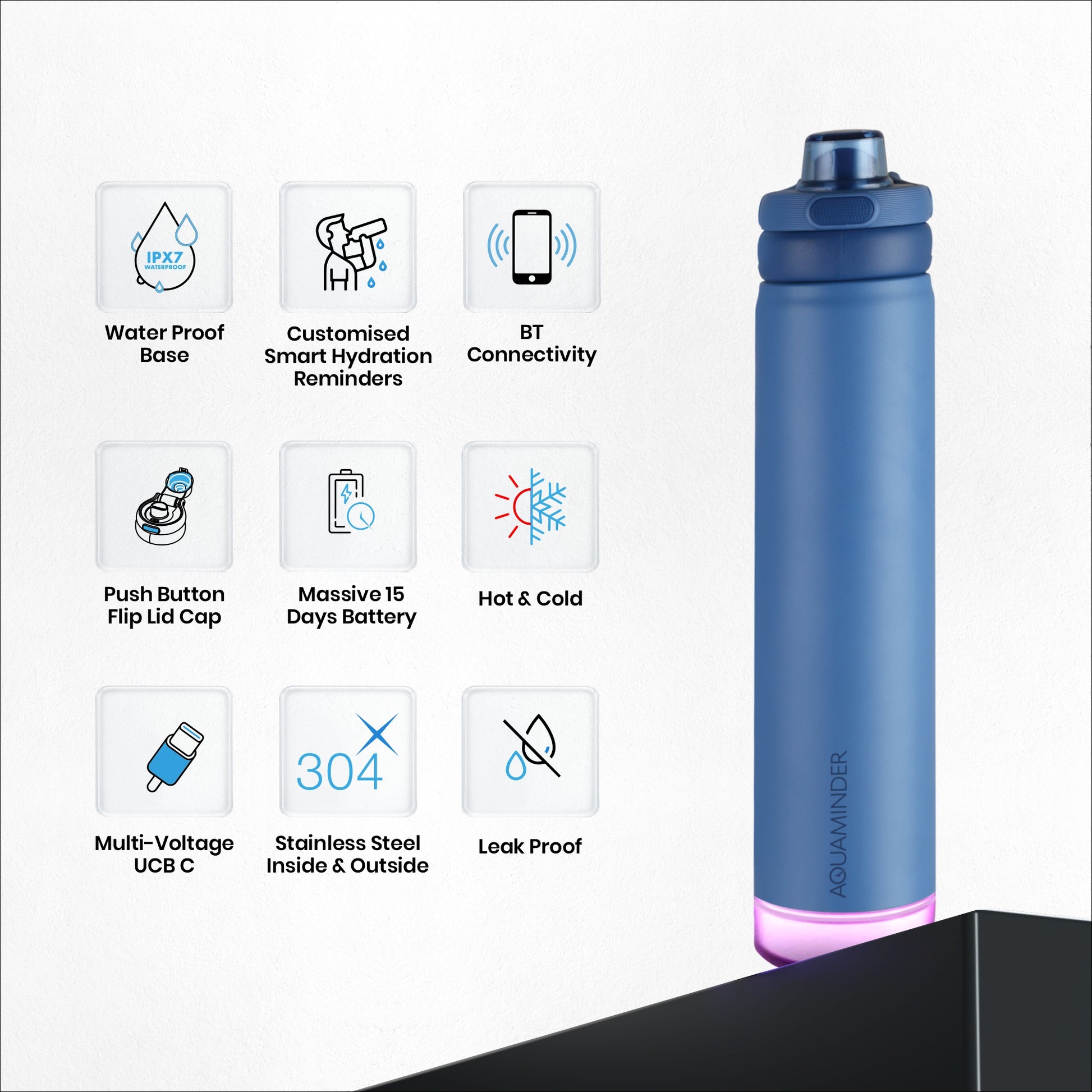 - Mobile App Connectivity- Connect with Aquaminder app & customize your Hydration reminder.